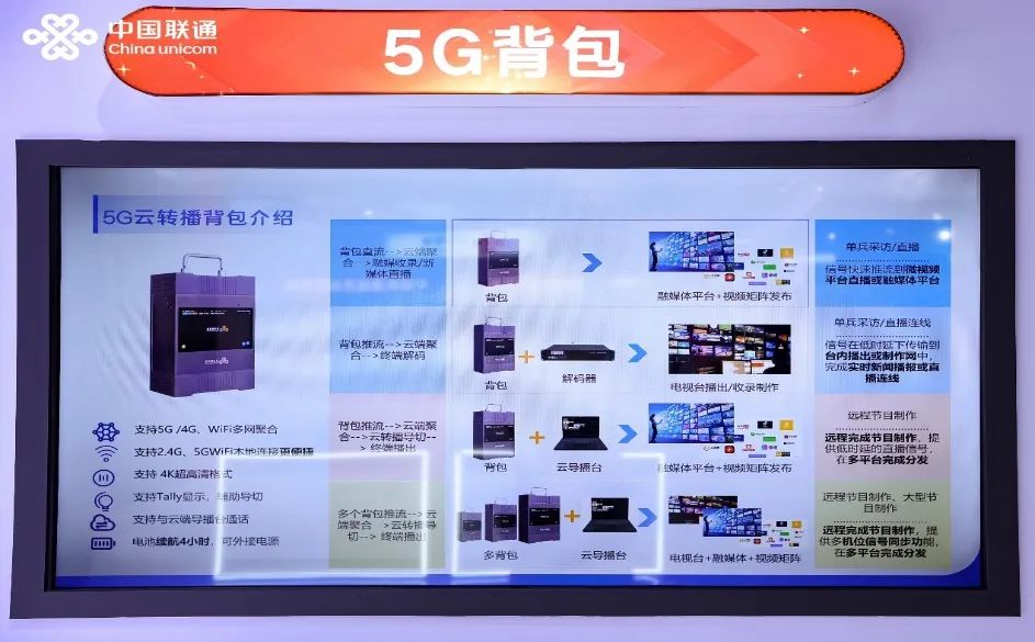 北京联通此次展示的5G云转播背包具有体积小、功能强的特点,可实现视频信号采集、编码、视频实时回传,对输入音视频信号进行高效编码生成IP流,并通过多链路(5G/4G)进行聚合传输。基于5G、云计算、人工智能等新兴技术,通过前端信号采集、云端传输处理和远程导播制作三个环节,实现转播设备云端化和人员服务远程化的新科技,全面体现联通5G云网优势。