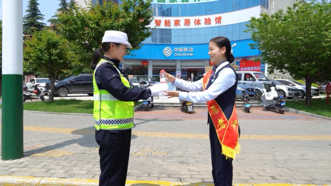 铜川市正阳路营业厅外,也发生了类似一幕。正午时分,营业厅经理连亚萍将客户送到门口时,远远瞧见十字路口的交警扶着路灯杆似乎要晕倒,赶忙上前了解情况,原来是烈日高温下的执勤让警官有些中暑,连亚萍连忙拿来饮用水和解暑药让她服下,并告知她营业厅里设置了“爱心驿站”,有需要随时可以来休息。