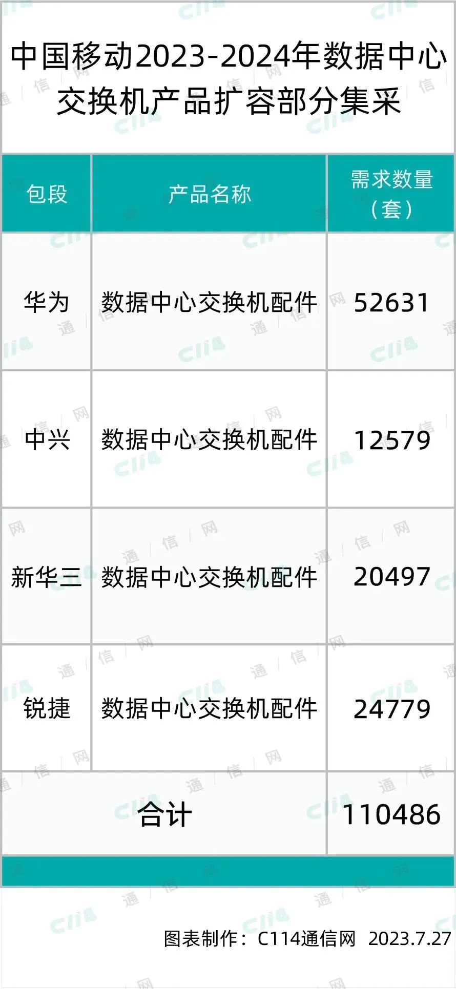 C114讯 7月28日消息 来自中国移动的官方信息显示,中国移动陆续公示了2023年至2024年数据中心交换机产品集采结果,本轮集采分为新建与扩容两个部分。