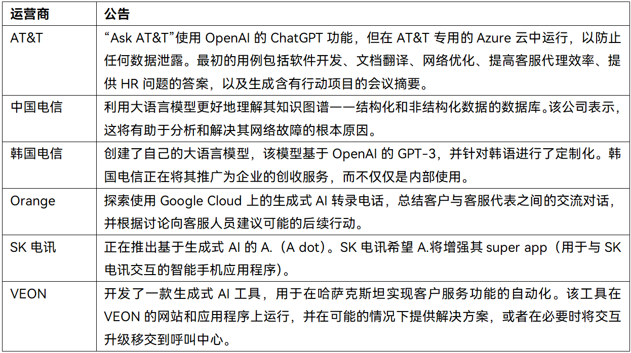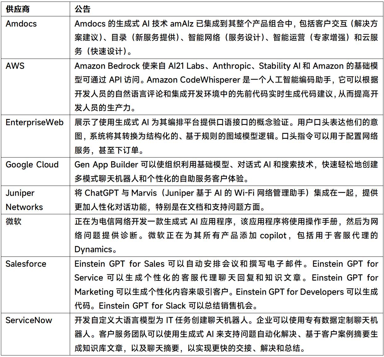 表2提供了一些活跃在电信行业的供应商的生成式AI公告示例。