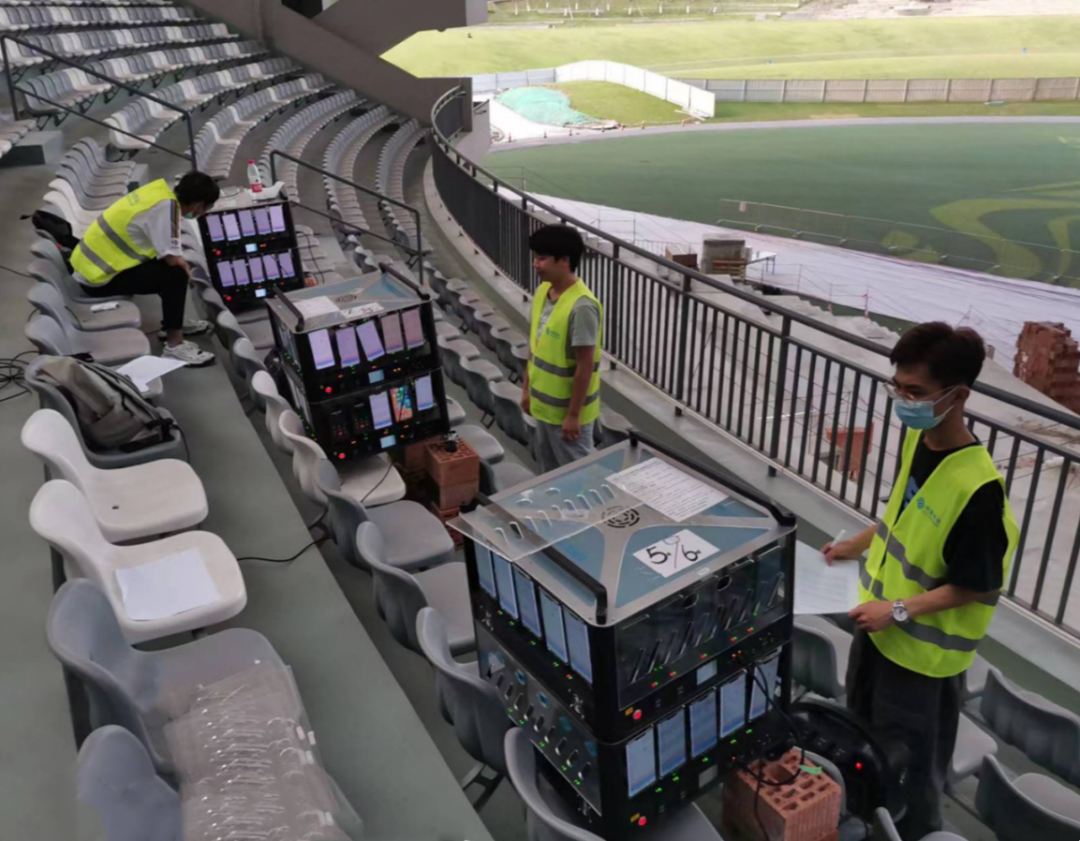 本次测试针对看台区域的弱覆盖问题、同频干扰问题等进行了拉网式遍历测试,同时对网络设备的上下行并发性能瓶颈进行了针对性的摸底和改进。测试期间,在东安湖主体育场23个区块、凤凰山体育场6个区块和媒体中心工作区共计30个区块设置测试点,使用13台研究院自研大容量测试集装箱,同时控制460部真实5G终端模拟单扇区观礼观众,针对不同组网模式分别开展大型活动场景下的混合业务、上行并发、下行并发3种业务模型的遍历测试,累计执行测试用例超过220次,单次平均耗时达30分钟。同时针对其他覆盖场景,专注“微信小包、视频直播、语音通话”等赛时用户常见业务,结合后台网络侧KPI数据,模拟探索出不同站型部署方式下的业务模型拐点和基站性能瓶颈。