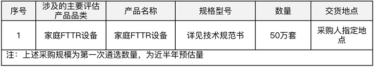 根据此前招标公告显示,中国电信2023年家庭FTTR设备集中采购项目第一次遴选数量为50万套,为近半年预估量。