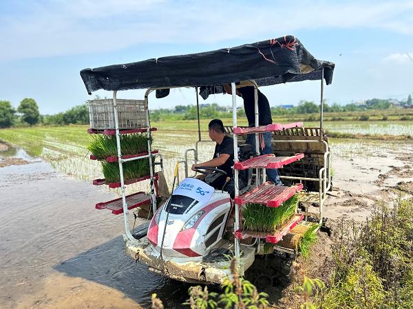 栽种初夏秧,稻谷满粮仓。不久前,武汉市黄陂李家集街畅享荣达农机合作社400余亩水稻开始进入抢插期。波光粼粼的稻田中,科技感十足的插秧场景实力“抢镜”。在中国移动“5G+北斗”高精定位技术支撑下,插秧机栽插的秧苗行行笔直,1机1天能完成30-50亩作业面积,不仅省时省力,还节省了播种成本。