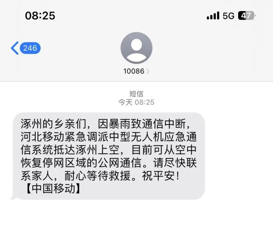 “【中国移动】——涿州的乡亲们,因暴雨致通信中断,中国移动紧急调派中型无人机应急通信系统抵达涿州上空,目前可从空中恢复停网区域的公网通信。请尽快联系家人,耐心等待救援。祝平安!”8月3日早晨,保定涿州灾区的群众收到一条来自空中的问候短信。