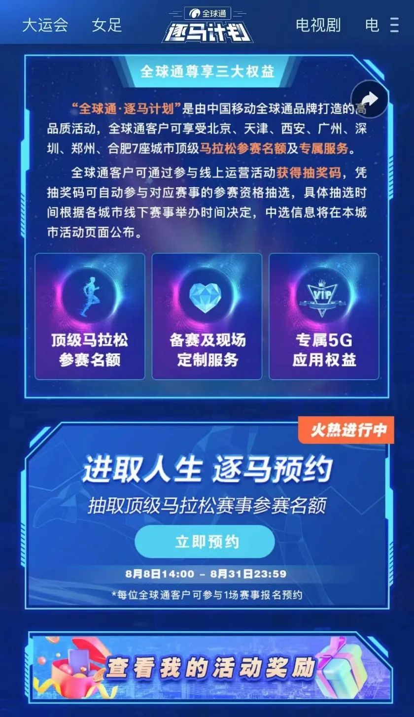 据了解,全球通客户可通过中国移动APP、咪咕视频APP等渠道的逐马计划专区预约报名。8月8日至8月31日,全球通客户可通过参加“逐马预约”,选择1个城市获取对应赛事的参赛名额抽奖码。8月16日至8月31日,“全球通逐梦跑者”征集评选,全球通客户可通过创作并上传符合主题要求的视频/图片内容,经投票选出各城市赛道排名前5的用户,可获得对应赛事的参赛资格。