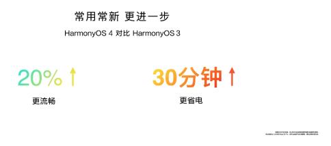 HarmonyOS 4采用全新华为方舟引擎,实现在图形、多媒体、内存、调度、存储、低功耗等能力的显著提升。相比上一代系统,HarmonyOS 4的滑动流畅性提升20%,续航增加30分钟。多项常用操作的响应速度也得到了大幅优化,如相机启动速度提升57%,用户在支付、导航等场景也有更顺滑的使用体验。