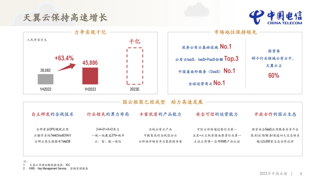 C114讯 8月9日消息(水易)国云框架已经成型,发布AI大模型,移动用户数突破4亿,成立中电信量子信息科技集团......,中国电信在2023年上半年有很多属于自己的高光时刻,这些高光时刻给中国电信带去的不仅是品牌影响力,更是业绩的提升。