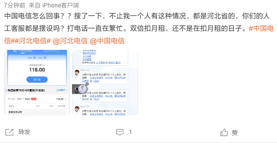 据称,河北电信以往通常在月初扣一次月租,而此次在月中无预警扣除了双倍月租,招致了大量用户的疑惑和不满。也有用户反馈称,人工客服热线“打了几十遍”也打不通,线上人工客服也联系不上。