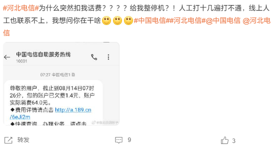 今日有网友投稿反馈、微博大量网友称,河北电信今日凌晨期间突然扣费,大多扣除了用户当月套餐的双月套餐费用,导致用户欠费停机。