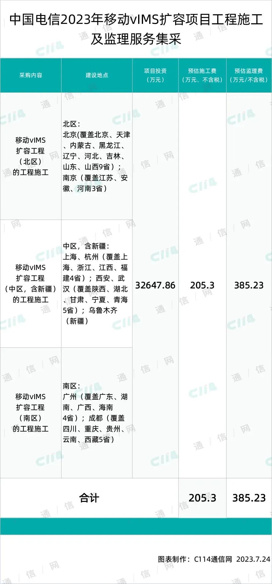 据此前中国电信发布的集采公告显示,中国电信2023年移动VIMS扩容工程总预算32647.86万元(不含税)。其中施工费约205.3万元(不含税);监理费约385.23万元(不含税)。