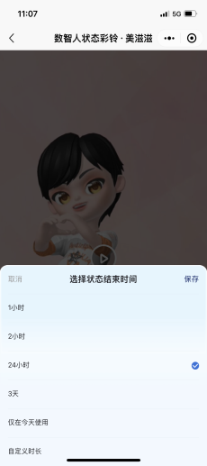 市面上很多互联网APP应用均有状态类产品,状态已成个性表达的重要方式。“数智人状态彩铃”立足通话场景,融合了数智人载体与视频彩铃形式,具有天然的独家优势。产品实现中除了融入数智人表达个人状态,还实现了设置视频彩铃时,同步设置该状态的生效时间,或2小时或1整天,在该时间内个人状态始终呈现给来电的朋友,生效时间结束则该数智人状态彩铃自动取消。