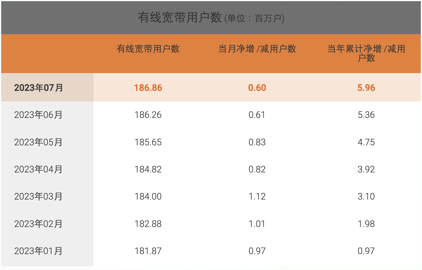 有线宽带业务方面,当月中国电信有线宽带用户数净增60万户,有线宽带累计用户数1.8686亿户。固定电话业务方面,当月中国电信固定电话用户数净减33万户,固定电话累计用户数1.0285亿户。