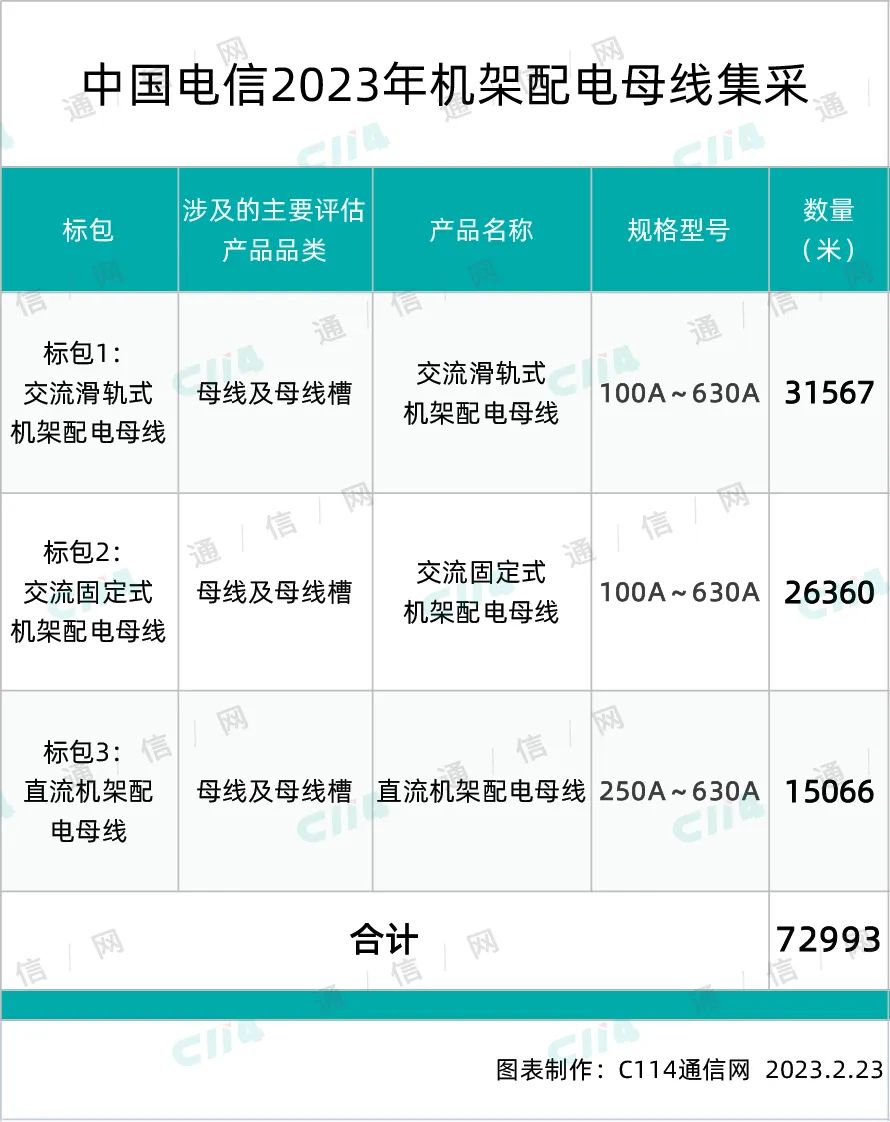 据此前中国电信发布的集采公告显示,本次采购内容为中国电信集团有限公司和中国电信股份有限公司及其下属子公司、分公司在两年内所需的机架配电母线产品,包括交流滑轨式机架配电母线、交流固定式机架配电母线、直流(滑轨式/固定式)机架配电母线。采购总规模为72993米。项目共划分成3个标包。
