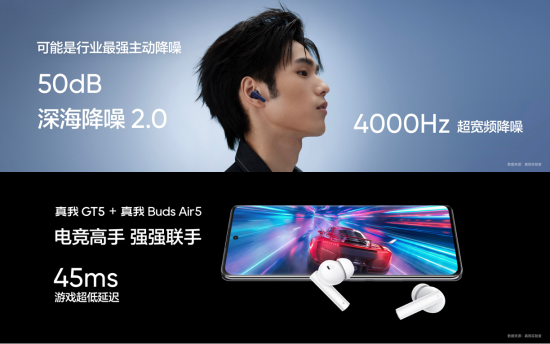 此次发布会上,真我还带来两款降噪TWS新品。真我Buds Air5采用自研深海降噪2.0技术,可实现最高50dB降噪深度和4000Hz超宽频降噪,实现至高 99.6% 有效背景噪音消除。同时,其配备新升级的六麦AI深度通话降噪,可以大幅提升通话清晰度。