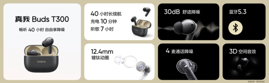真我Buds T300是续航最强的入门降噪耳机,可实现长达40小时综合续航,较上一代提升42%。耳机单次充满提供8小时音乐播放和4小时通话,满足用户周充需求。降噪方面,真我Buds T300提供最高30dB主动降噪和四麦AI深度通话降噪,嘈杂环境下也能带来安静的聆听空间和清晰的语音通话效果。