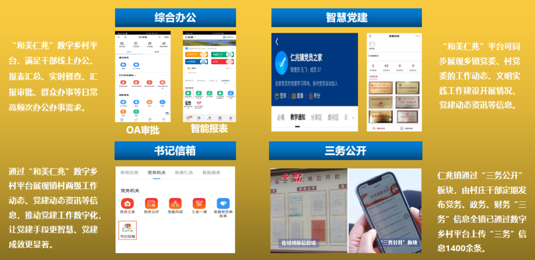 以平度仁兆镇为例,针对乡镇一级传统的管理、服务手段,已远不能满足工作需要,亟需在新的管理、服务模式上进行探索创新这一情况,山东联通与仁兆镇合作,探索搭建“和美仁兆”数字乡村平台,把镇村一体化办公办事、基层治理现代化工具、惠民服务、生活学习四大功能集于一体,覆盖全镇91网格村、7万人口,实现数字赋能乡村发展、赋能乡村治理、赋能乡村服务,切实为农业农村发展注入新动能。