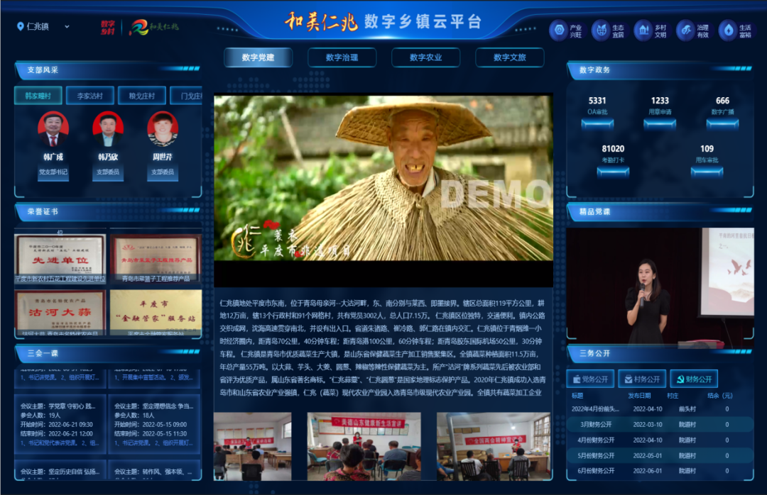 通过“和美仁兆”数字乡村平台展现镇村两级工作动态、党建动态资讯等信息,推动党建工作数字化,让党建手段更智慧、党建成效更显著。在数字乡村平台中设立“三务公开”板块,由村庄干部定期发布党务、政务、财务“三务”信息,村民可随时自主查看,确保了村庄日常规范化管理事项公开及时,并接受群众的有效监督。截至目前,已通过数字乡村平台上传“三务”信息2700余条。设立“三会一课”板块,主要用于记录会议主题、会议类型、发起人、参会人等会议内容,党员干部经过所在党支部平台管理员审批后,可自己发起会议学习,也可以查看所在党支部的会议记录,实现党的文件人人学、党的活动人人知、党的思想人人懂,进一步夯实农村基层党建。