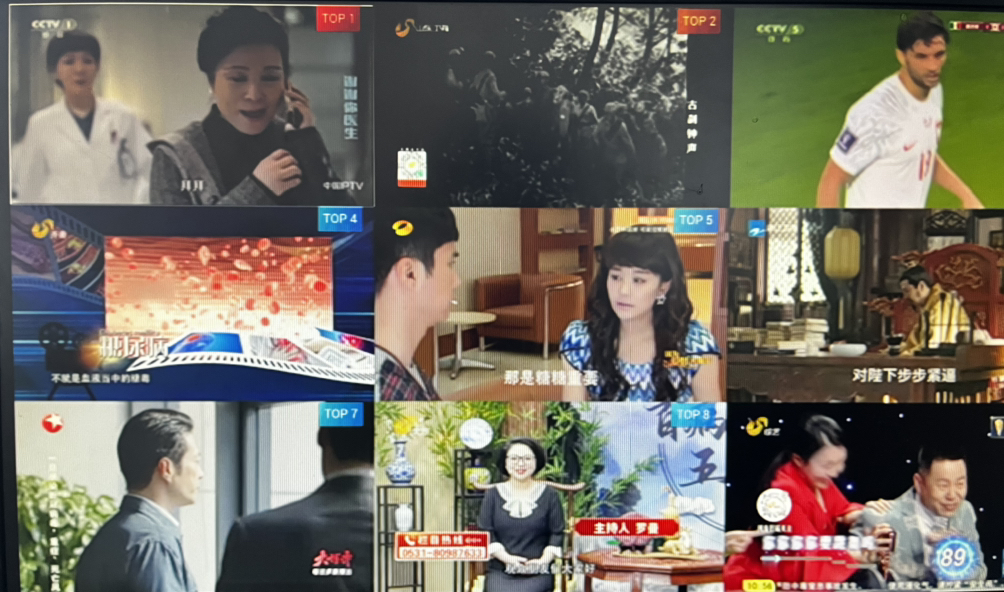 在电视屏幕上查看九个频道的播放画面,并可根据自身偏好选择中意的频道进行观看。