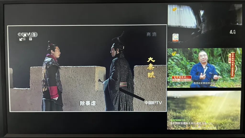 用户可在屏幕上同时观看一大三小四路直播频道画面,根据观看需求任意切换主画面。