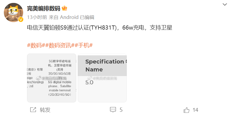 日前,一款型号为 TYH831T 的新机通过了国家 3C 认证,产品类型为 5G 数字移动电话机 / 卫星移动终端,支持 66W 快充。这款新机的申请人和制造商均为天翼电信终端有限公司,生产厂为微格科技(南京)有限公司。