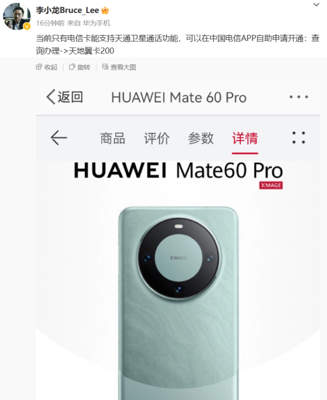 华为于 8 月底正式发售华为 Mate60 Pro 手机,引发网友热议,其中该产品搭载的卫星通话功能成为焦点之一。据华为终端 BG CTO 李小龙消息,这一功能目前并不是四大运营商都可用的。当前只有电信卡能支持天通卫星通话功能,可以在中国电信 App 自助申请开通:查询办理 -> 天地翼卡 200。这一业务的价格为 200 元 / 月,支持 200 分钟的国内通话,超出后 1.6 元 / 分钟,主、被叫双向均收费。