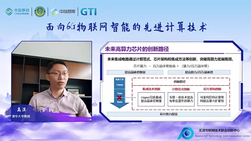 清华大学高滨教授在《面向6G物联网智能的先进计算技术》的主题演讲中,介绍了传统计算芯片技术面临的瓶颈,以及芯粒集成和存算一体两种创新技术的优势,并提出6G物联网技术将推动终端、边缘和云端实现爆炸式的算力增长。基于忆阻器的存算一体技术,实现了算力和能效的大幅提升,将深度赋能我国自主可控的算力基础设施建设,未来将在6G物联网领域具有广泛的应用前景。