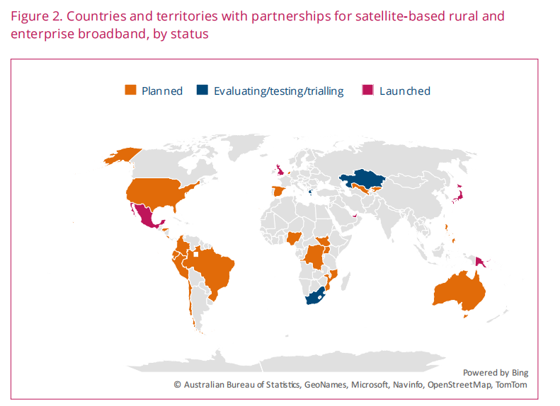 此外,报告写到,这项技术已被广泛用于提供农村地区的宽带网络覆盖,并且仍然是截至目前最受欢迎的卫星通信用途,占所有已确定合作伙伴关系的59%。不过,在全球范围内推出基于卫星的宽带服务的过程仍处于起步阶段。截至2023年8月,已有5个合作伙伴关系推出了卫星宽带服务,4个合作伙伴关系正在进行评估、测试或试验,另外有32个合作伙伴关系已有服务规划。