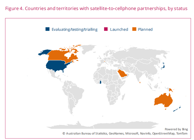 截至2023年8月,有4个合作伙伴关系正在评估、测试或试验卫星直连手机技术,另有16个合作伙伴关系计划推出卫星直连手机技术。有14个国家和地区正在计划、评估、测试或已经建立了卫星直连手机的伙伴关系。其中,加纳、日本、新西兰和美国目前正在评估、测试或试验这项技术,另有11个国家和地区正在规划服务。