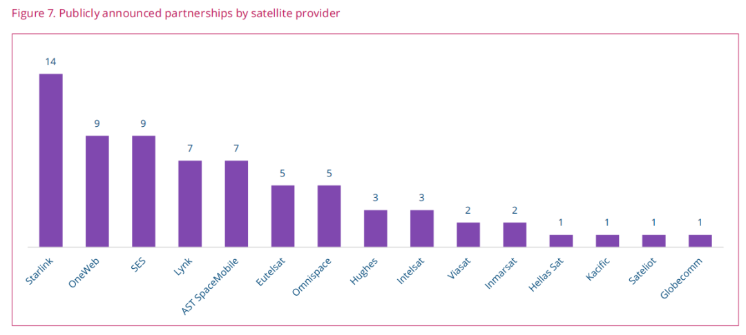 这份报告中写到,多家卫星服务提供商已经与移动运营商建立了合作关系。截至2023年8月,Starlink成为第一家拥有超过10个合作伙伴的提供商,以达成14个合作伙伴关系领先;SES和OneWeb都达成了9个合作伙伴关系。紧随其后的是AST SpaceMobile和Lynk,分别达成了7个合作伙伴关系,以及Omnispace(5个)和Eutelsat(5个)。其他供应商,如西班牙的Sateliot、新加坡的Kacific和希腊的Hellas Sat,都各达成了1个合作伙伴关系。