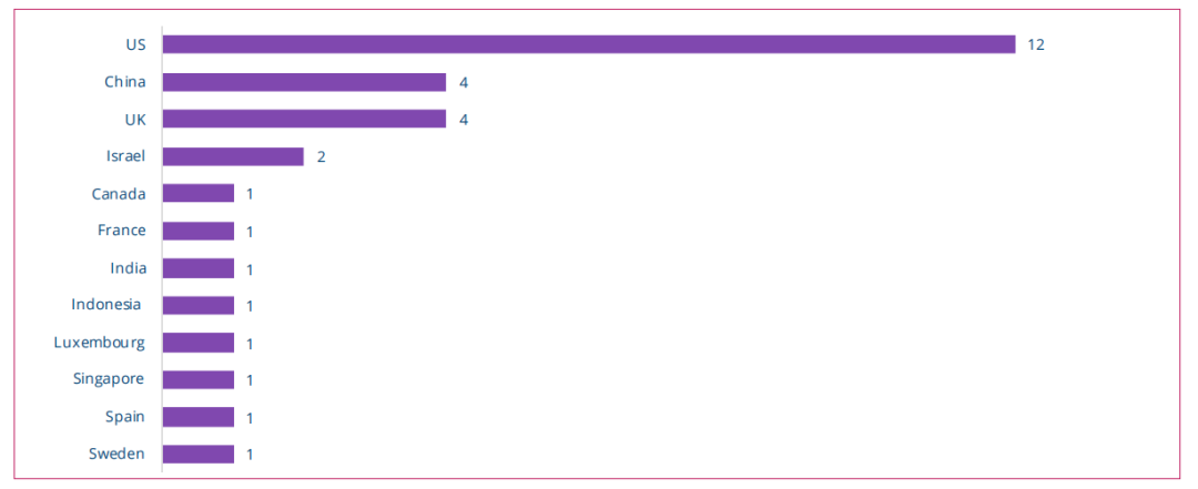 总体而言,有12个国家和地区拥有提供宽带、语音和数据或卫星直连手机技术的卫星服务提供商。目前,美国拥有最多的提供商,数量为12家,其次是英国和中国,各有4家。以色列是另外一个拥有多个卫星供应商的国家。