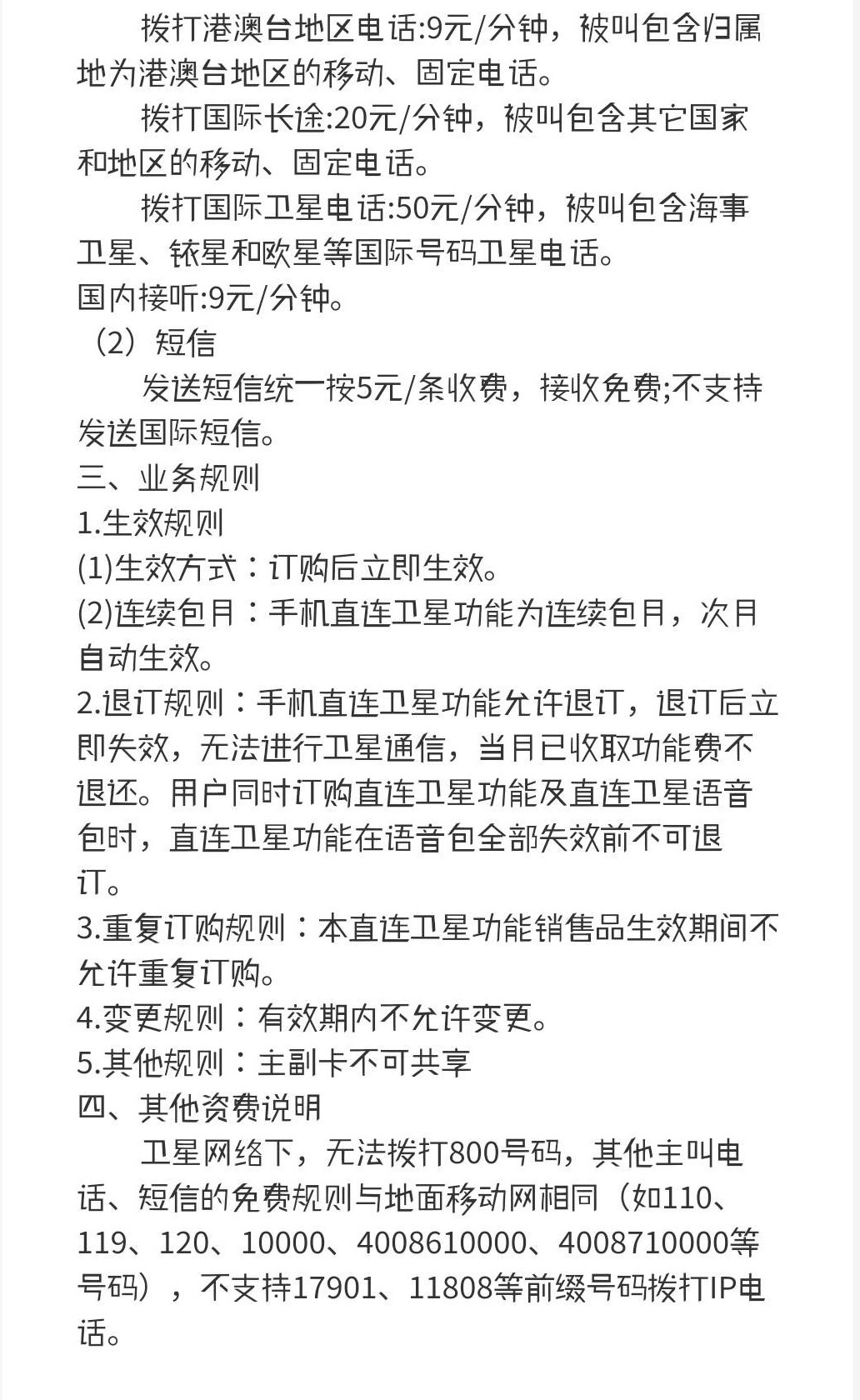 国际通话标准资费主被叫 20 元 / 分钟、国际卫星电话主被叫 50 元 / 分钟(海事卫星、钺星、欧星等);直连卫星功能订购立即生效,功能费一次性收取,退订也是立即生效,当月功能费不退还。
