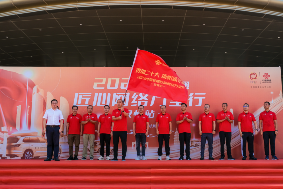 泉州市通信发展管理办公室主任张谋总、福建联通云网运营中心总经理郑海波、泉州联通总经理王启文、泉州联通副总经理许绍松等出席匠心网络万里行·泉州站发车仪式,王启文将万里行启航旗帜交给车队代表。