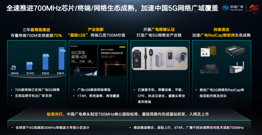 3)持续底层技术创新,打造“超级n28”终端增强700MHz网络能力。基于中国广电制定的700MHz终端增强国际标准,联合产业伙伴研发推出了全球首批“超级n28”增强型700M终端,实现网速及覆盖能力翻倍,显著提升了低频5G的端网能力。