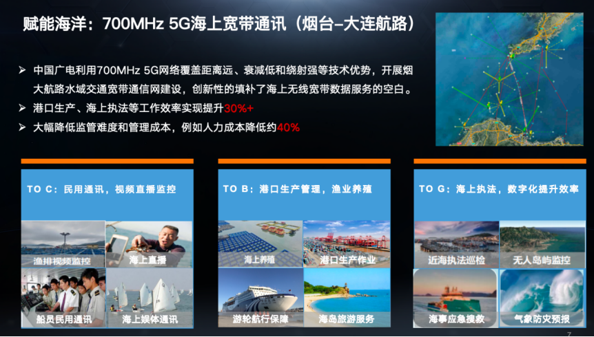 其中,在赋能海洋经济方面,中国广电山东公司利用700MHz 5G网络覆盖距离远、衰减低和绕射强等技术优势,开展了烟台到大连航路水域的交通宽带通信网建设,利用海岛部署700MHz广域覆盖5G网络,创新性的填补了海上无线宽带数据服务的空白,充分满足to B港口生产管理和渔业养殖、to C民用通信和视频直播、to G海上执法等全领域需求,相关领域工作效率实现30%以上的提升,大幅降低监管难度和管理成本,一阶段已实现人力成本降低40%左右。