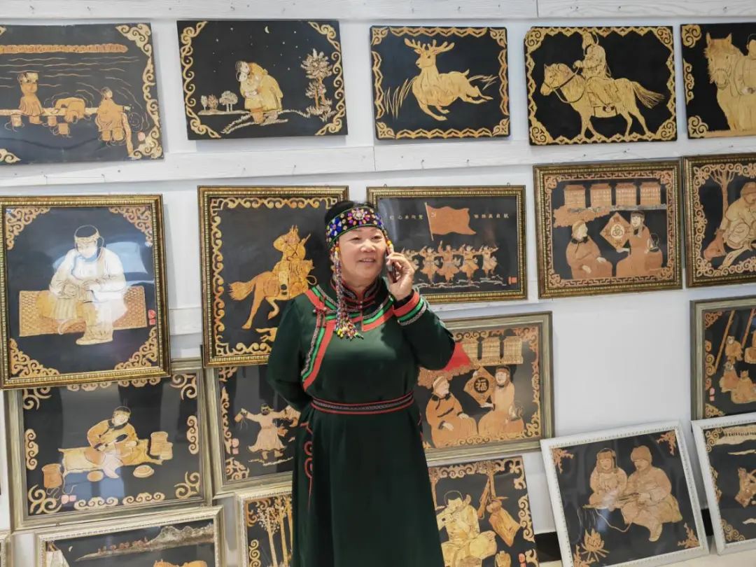 (呼玛白银纳乡鄂伦春族桦树皮镂空画非物质文化遗产传承人关桃芳用5G手机与远方亲人通话)
