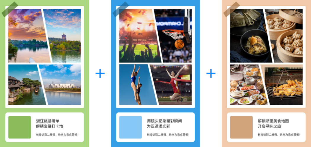 亚运赛事期间,照片直播活动用户可选择“比赛现场”、“浙江美景”、“浙江美食”三类内容、以视频或照片形式进行分享。用户通过集赞还有机会获得亚运吉祥物等奖励。上传内容后可以生成分享海报,发送至朋友圈、家庭好友群发起集赞邀请,和亲朋好友一起为亚运打CALL,让更多亚运精彩瞬间汇聚、展示、分享。