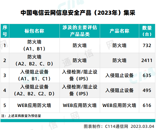 根据此前资格预审公告显示,本项目共划分5个标包,分别为防火墙(A1、B1)标包、防火墙(A2、B2、C、D)标包、入侵阻止设备(A1、B1、C1)标包、入侵阻止设备(A2、B2、C2、D)标包和WEB应用防火墙标包。预计总集采规模4889台。