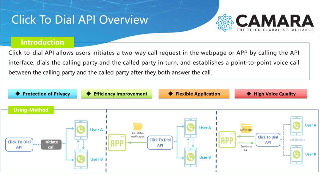本次在CAMARA通过的点击拨号项目是中国移动能力开放行业拓展的重点领域之一,旨在为企业平台与应用提供支持用户隐私保护的高效、灵活、多样化的单点与多点语音通话能力,帮助企业构建独立的个性化话音业务为其用户服务。前期,中国移动基于完善的网络基础设施,汇聚外呼多方、号码翻译、媒体处理等通信能力,面向政府、互联网企业等B端用户构建点击拨号能力,现已向上百家企业提供服务,月均调用量超1亿。该能力的引入丰富了CAMARA中的能力类别,开辟了话音能力新赛道,同时补全了Open Gateway在话音通信领域的缺失,为构建全球运营商能力开放奠定基础。