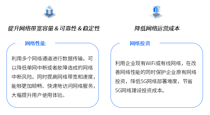 多网通服务通过聚合5G+WiFi、5G+5G、5G+有线等多种网络资源进行数据传输,提升网络带宽容量和抗弱网能力,有效解决当前5G在垂直行业应用中上下行容量受限、时延、抖动的痛点,保障网络的端到端体验。并且能利用企业现有WiFi或有线网络,在改善网络性能的同时保护企业原有网络投资,降低5G网络建设难度,节省5G网络建设成本。