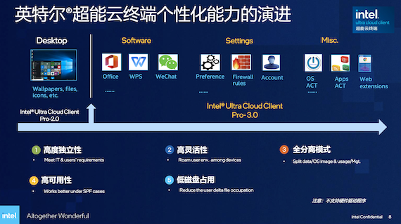 “用户在使用超能云终端类的解决方案时,不希望集中管理破坏或冲突自己个性化的应用和计算环境,这会直接影响到用户体验,因为他会和PC进行对比,为什么一管理,我的东西就全没有了?”英特尔技术专家说出了很多用户的心声与痛点。