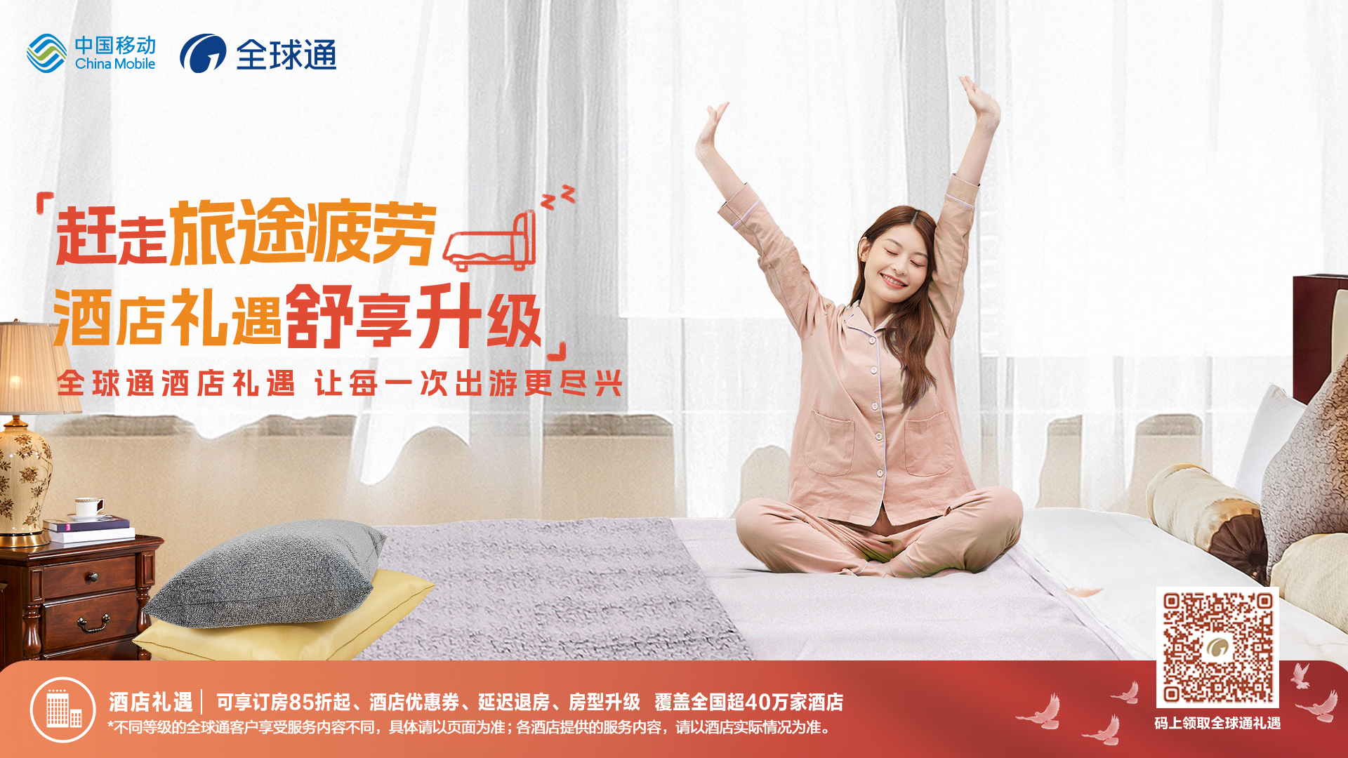 好在全球通客户可享订房折扣85折起、酒店优惠券、延迟退房、房型升级等福利,合计覆盖全国超40万家酒店,让你优价舒适入住。此外还能享受高达315元的景区门票专享券包,覆盖全国超17000个景点景区。