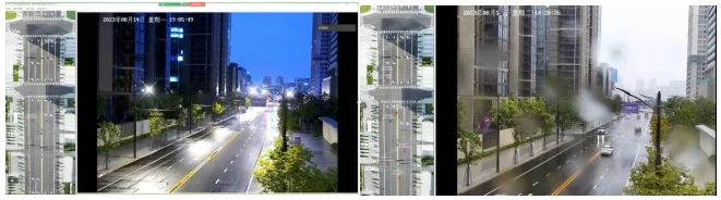 黑夜天和雨雾天车辆内可获取超视距感知画面(右侧为摄像头视距内画面,左侧为通感基站对道路全景的感知孪生)