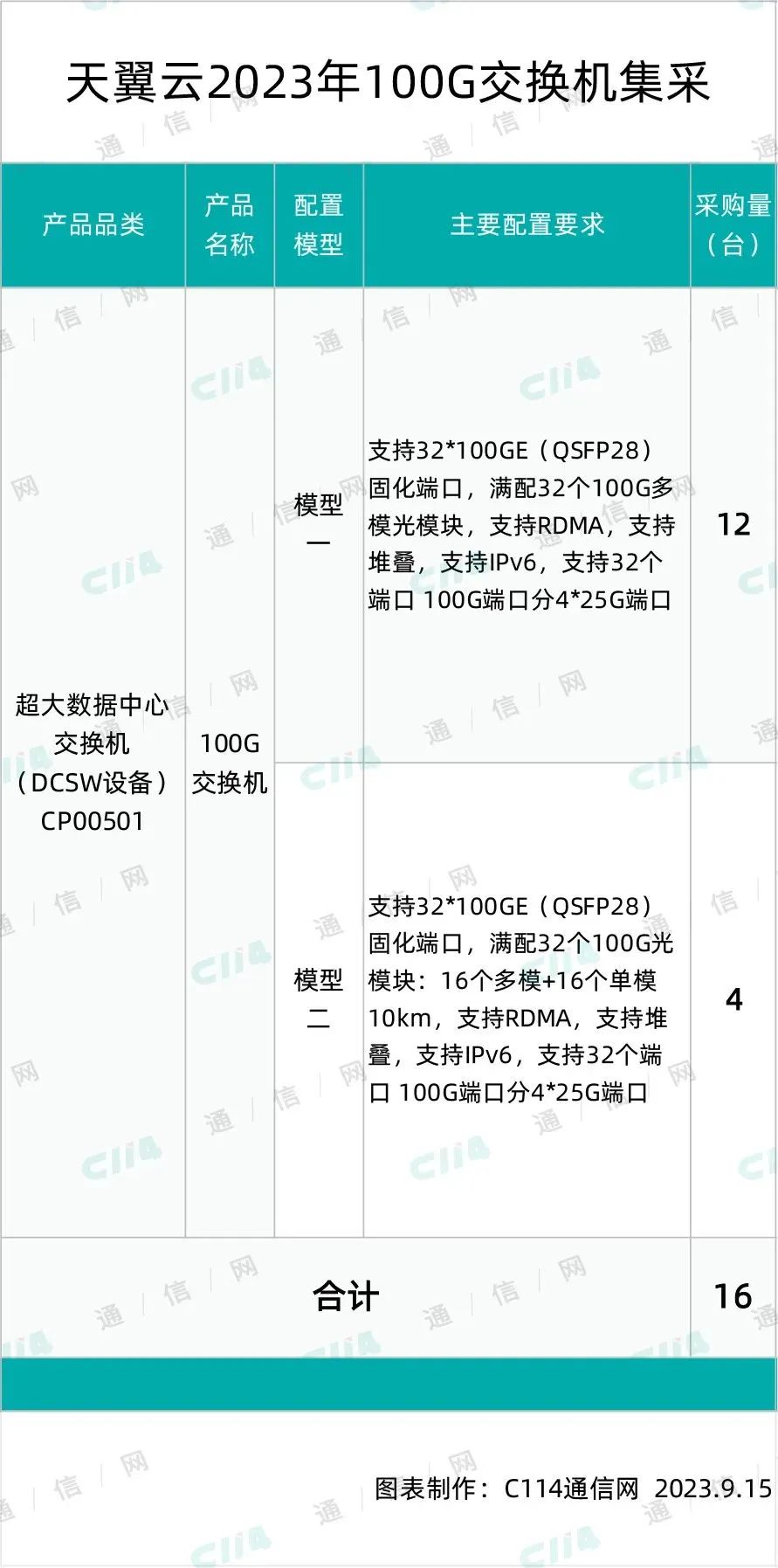 中国电信方面表示,为满足比选人业务需求,需采购100G交换机,主要涉及两种模型,采购总量为16台。