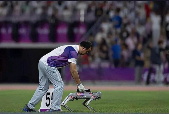 在田径赛场,满场奔波的机器狗成为最可爱的“显眼包”。每当铁饼选手投掷结束,几只身穿紫色“工作服“的机器狗,就一直追着铁饼跑,负责将铁饼运回。它们背上有个卡槽,专门放铁饼,每天往返于赛场捡器材,成为一只勤劳的“搬运狗”。