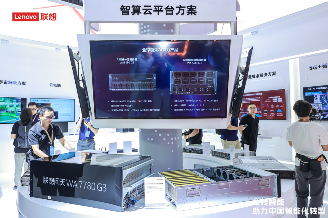 在AI导向的基础设施方面,联想集团推出了问天WA7780 G3 AI大模型训练服务器和联想问天WA5480 G3 AI训推一体服务器,以及专为运营商定制、用于大中型企业和云服务提供商设计的2U双路服务器问天WR5220 G3产品。同时,还展示了基于打造绿色算力的温水水冷技术。联想也希望通过基于智算、超算、通算三大算力场景,助力运营商加快提升自身数字底座建设步伐,实现算力升级。