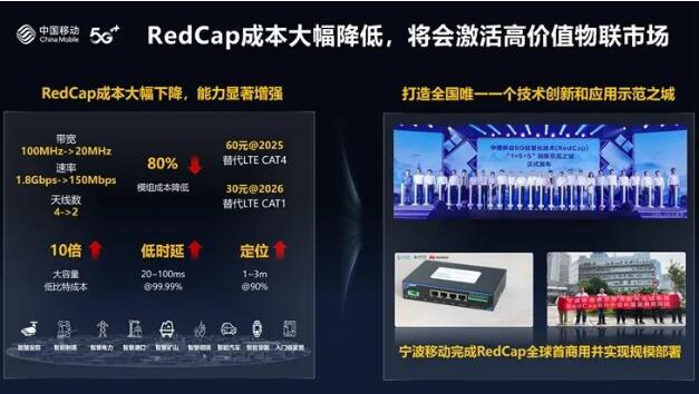 宁波是RedCap“1+5+5”技术创新与应用示范城之一,宁波移动携手华为已率先完成RedCap的技术验证,并在宁波李惠利医院已实现全球首商用规模商用。早在2022年11月,宁波移动就已通过5G基站的平滑升级快速部署RedCap技术,并完成了全省首个5G RedCap技术单站性能外场测试验证,测试结果显示用户上下行峰值速率分别为159Mbps和82Mbps,端到端时延13毫秒,相对于5G,在连接速率、时延等能力提升了10倍,并利用裁剪终端收发带宽、天线数、处理能力等,将成本降低80%,充分验证了5G RedCap终端在多种覆盖条件的上下行速率,以及VONR(5G语音通话)、用户面时延、自适应增删BWP(终端占用带宽),低成本等性能指标。