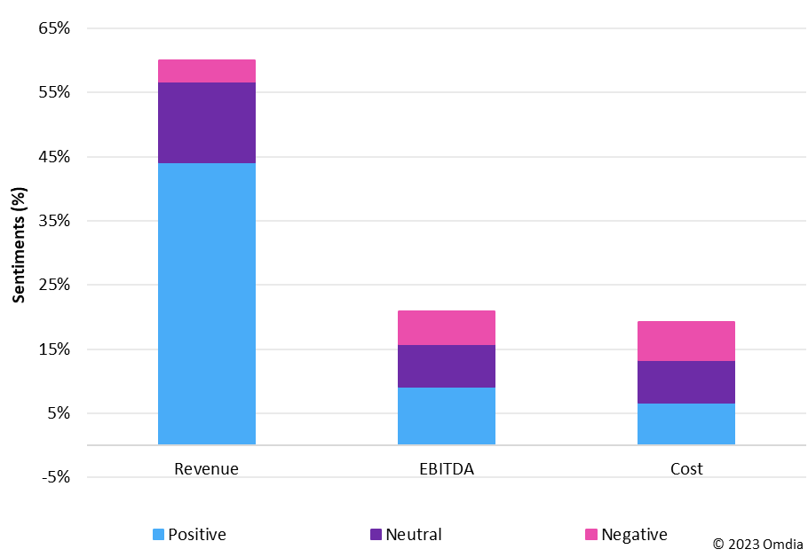 Omdia对在欧洲至少拥有一个运营部门的主要电信集团的2022财年财报中的收入、EBITDA和成本等关键词进行了情绪细分(见图1)。