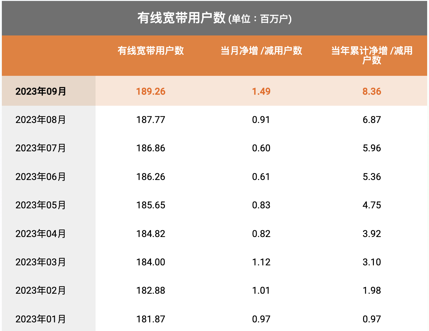 有线宽带业务方面,当月中国电信有线宽带用户数净增149万户,有线宽带累计用户数1.8926亿户。固定电话业务方面,当月中国电信固定电话用户数净减30万户,固定电话累计用户数1.0213亿户。
