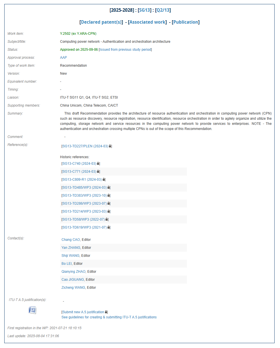 近日,由中国联通研究院主导制定的算力网络领域重要国际标准 ITU-T Y.2502 “Computing power network - Authentication and orchestration architecture”(算力网络 - 认证与编排架构)正式发布。该标准作为算力网络国际标准体系的核心组成部分,首次系统性构建了算力网络资源认证与编排的技术架构体系,为全球算力资源的安全合规接入、高效协同调度提供了技术框架。