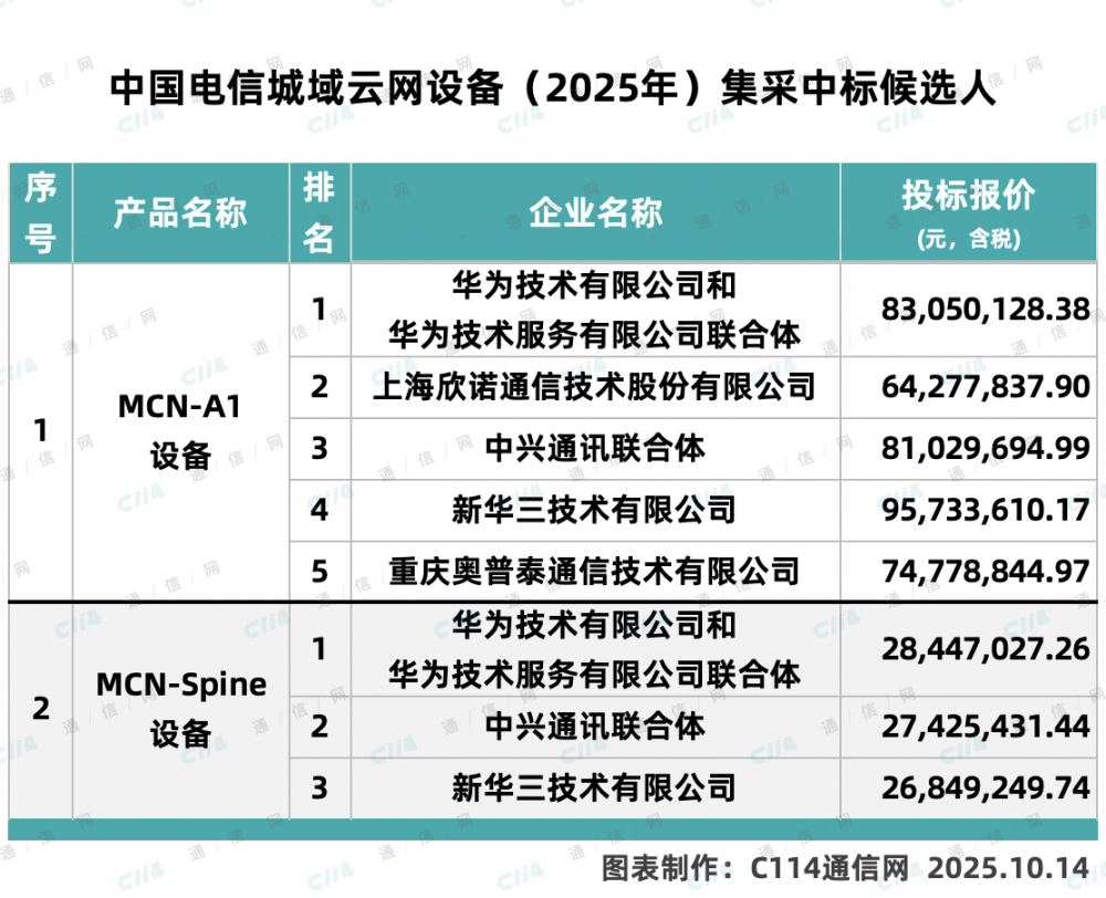 C114讯 10月14日消息(水易)来自中国电信阳光采购网消息,中国电信城域云网设备(2025年)集中采购项目MCN-A1标包和MCN-Spine标包公布中标候选人。